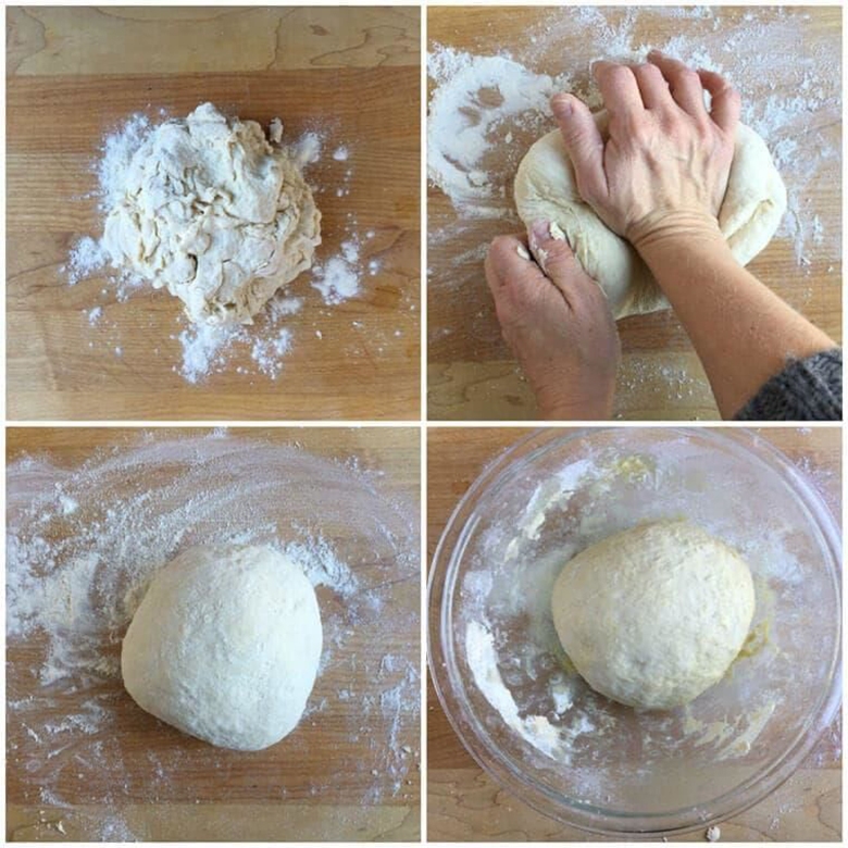 Lần thứ hai: Sau 1 tiếng, các bạn đem bột ra bàn và tiếp tục nhào. Bạn hãy rải một lớp bột khô lên bàn sau đó nhào và để khối bột không bị dính lên trên mặt bàn. Bạn nên nhào trong vòng 5 phút và cho vào thau để ủ thêm 1 tiếng nữa.