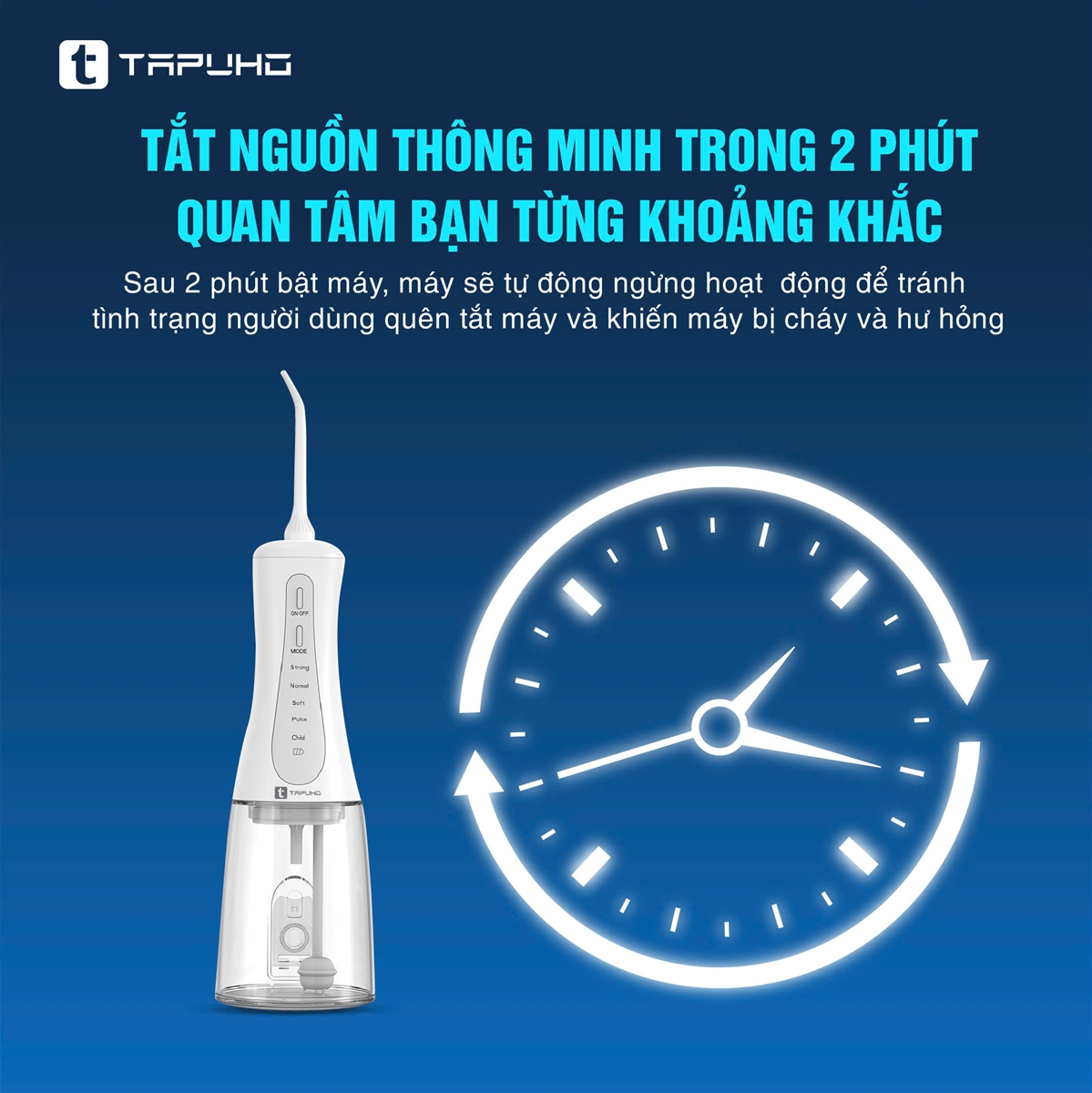 Cơ chế hoạt động đặc biệt: Tăm nước thông minh TAPUHO TWT2025 được thiết kế với cơ chế phun đứt đoạn theo từng nhịp. Các xung động nước tác động vào nướu và len lỏi qua từng kẽ răng, giúp làm sạch và mát-xa nướu hiệu quả mà không gây tổn thương cho nướu. Điều này đảm bảo răng miệng của bạn luôn được vệ sinh kỹ càng và khỏe mạnh. Đặc biệt, máy còn được thiết lập cơ chế khởi động tiếp sức 1 giây rất an toàn cho nướu: khi máy bắt đầu hoạt động, lực phun sẽ bắt đầu với lực phun thấp để nướu làm quen với lực nước phun, sau 1 giây tiếp sức lực nước sẽ trở lên bình thường.