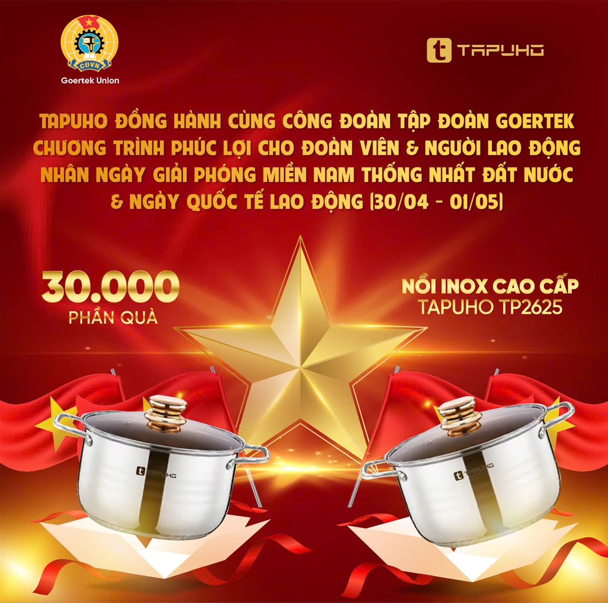 TAPUHO xin trân trọng thông báo, vào ngày 23/04/2025 sắp tới, TAPUHO sẽ đồng hành cùng Công đoàn Tập đoàn GOERTEK Chương trình phúc lợi giao tặng 30.000 sản phẩm nồi inox cao cấp TAPUHO TP2625 dành cho cán bộ đoàn viên và người lao động, nhân dịp đại lễ ngày Giải phóng Miền Nam thống nhất Đất Nước và ngày Quốc tế Lao động (30/04 – 01/05).
