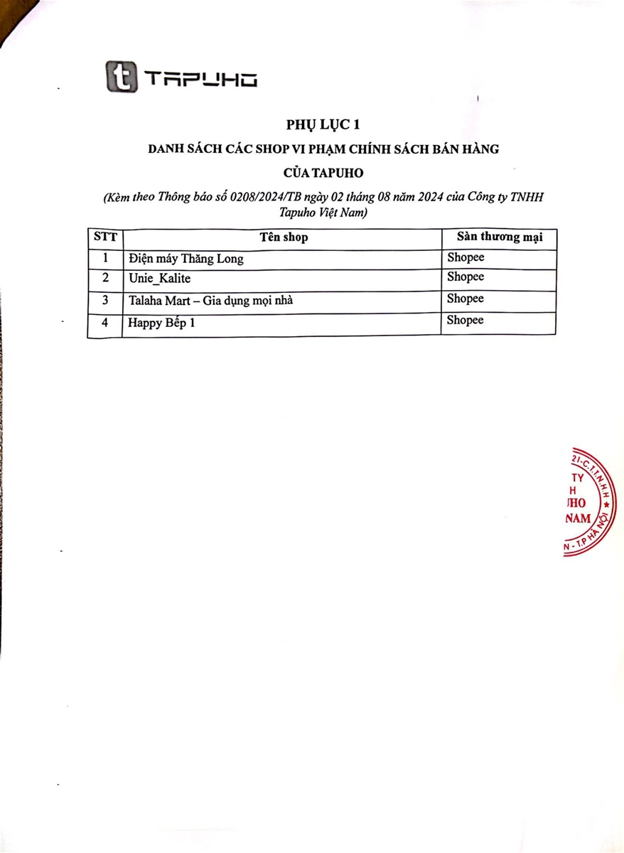 Thông báo chấm dứt bảo hành sản phẩm thương hiệu Tapuho đối với tất cả các shop vi phạm chính sách của TAPUHO